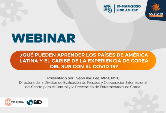 | «DETALLES Fecha: 31 de Marzo de 2020 Hora: 9:00 a.m. (hora Washington, D.C.) Idioma: Inglés Duración: 1 Hora Host: Red CRITERIA Regístrate aquí Te esperamos en el seminario en línea y recuerda visitarnos en RED CRITERIA. Mientras llega el día del seminario, te recomendamos: The Guardian (2020). Covid-19: South Koreans keep calm and carry on testing WSJ (2020). How South Korea Put Into Place the World’s Most Aggressive Coronavirus Test Program. RED CRITERIA« |