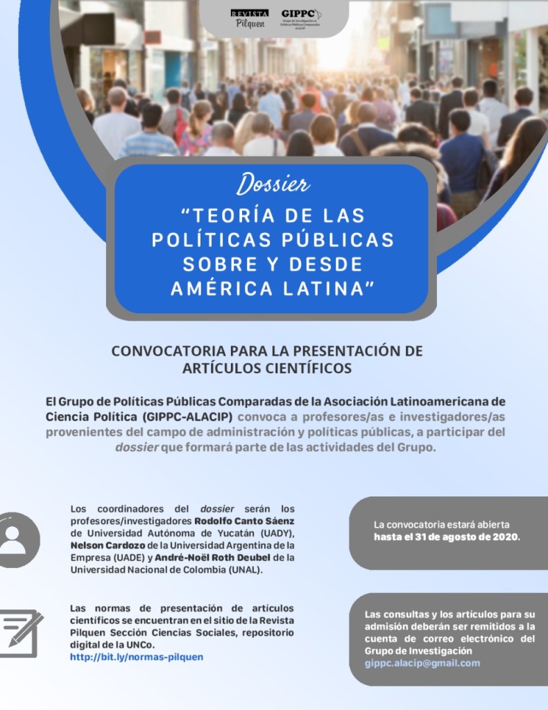 «El Grupo de Políticas Públicas Comparadas de la Asociación Latinoamericana de Ciencia Política (GIPPC-ALACIP) convoca a profesores/as e investigadores/as provenientes del campo de administración y políticas públicas, a participar del dossier que formará parte de las actividades del Grupo.»