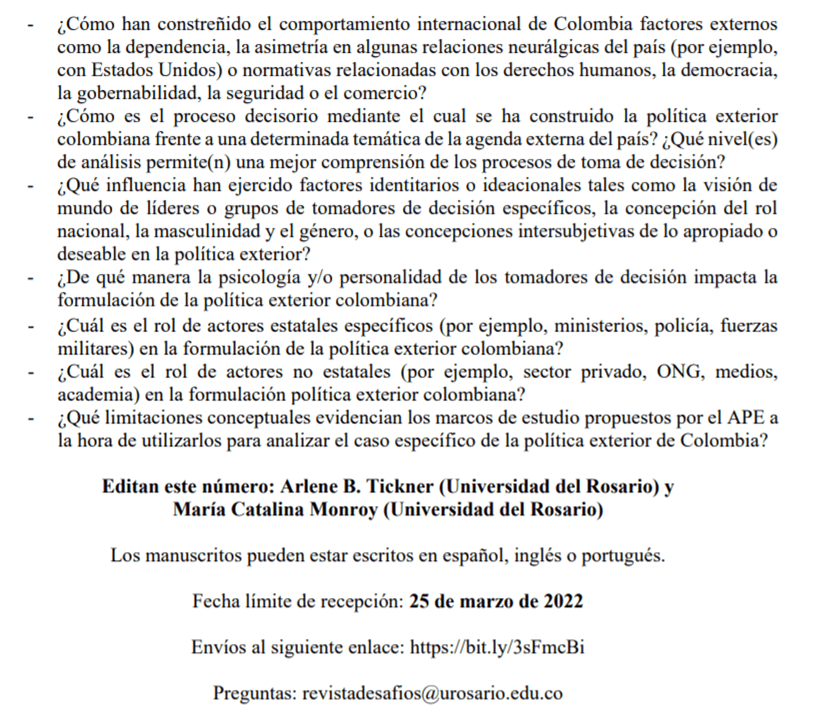 7 octubre, 20215 octubre, 2021 Juan David Gutiérrez R. Convocatoria de la Revista Desafíos para número especial sobre “Política exterior de Colombia: más allá de los lugares comunes” Compártelo: Haz clic para compartir en X (Se abre en una ventana nueva) X Haz clic para compartir en Facebook (Se abre en una ventana nueva) Facebook Me gusta Cargando... Relacionado