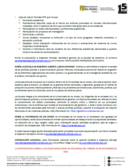 23 octubre, 2021 Juan David Gutiérrez R. Convocatoria para profesor/a de planta en políticas públicas en la Escuela de Gobierno de la U. de los Andes Compártelo: Haz clic para compartir en X (Se abre en una ventana nueva) X Haz clic para compartir en Facebook (Se abre en una ventana nueva) Facebook Me gusta Cargando... Relacionado