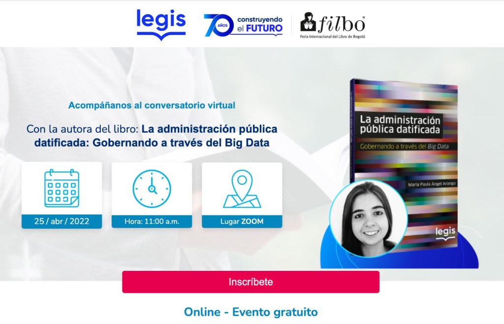 En el marco de la Feria del Libro de Bogotá, el próximo lunes 25 de abril, a las 11am hora local, tendrá lugar el conversatorio del libro «La administración pública datificada. Gobernando a través del Big Data». El evento contará con la participación de la autora, María Paula Angel, y será transmitido vía Zoom.