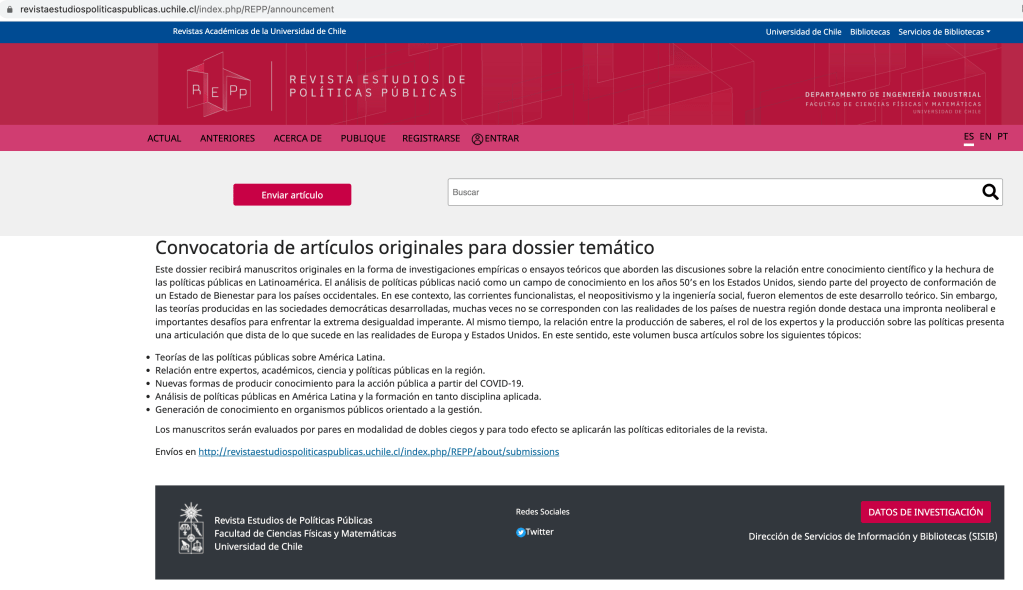 Nota sobre la revista: «La Revista Estudios de Políticas Públicas (REPP) es una publicación académica, con periodicidad bianual, de la Facultad de Ciencias Físicas y Matemáticas de la Universidad de Chile. Esta Revista, de carácter multidisciplinar, nace en 2015 con el propósito de aportar a la tarea de intercambio y difusión de la producción científica, donde se expresen los nuevos debates y discusiones sobre modelos teóricos, así como aportes a la conformación de masa empírica en el análisis de las políticas públicas latinoamericanas y su gestión. La política editorial busca publicar artículos que consideren las contribuciones nacionales e internacionales en los campos de las Ciencias Sociales como la Ciencia Política, la Sociología, la Economía , el Derecho Público y otras disciplinas cuyo objetivo, desde distintas aproximaciones disciplinares, sea el análisis de las políticas públicas y su gestión. REPP está orientada a investigadores/as, académicos/as, especialistas, estudiantes de postgrado, y formuladores de políticas públicas en América Latina. Se publican artículos sujetos a las condiciones de referato doble ciego y reseñas de publicaciones en esta área temática. La Revista Estudios de Políticas Públicas es parte del Portal de Revistas de la Universidad de Chile.»