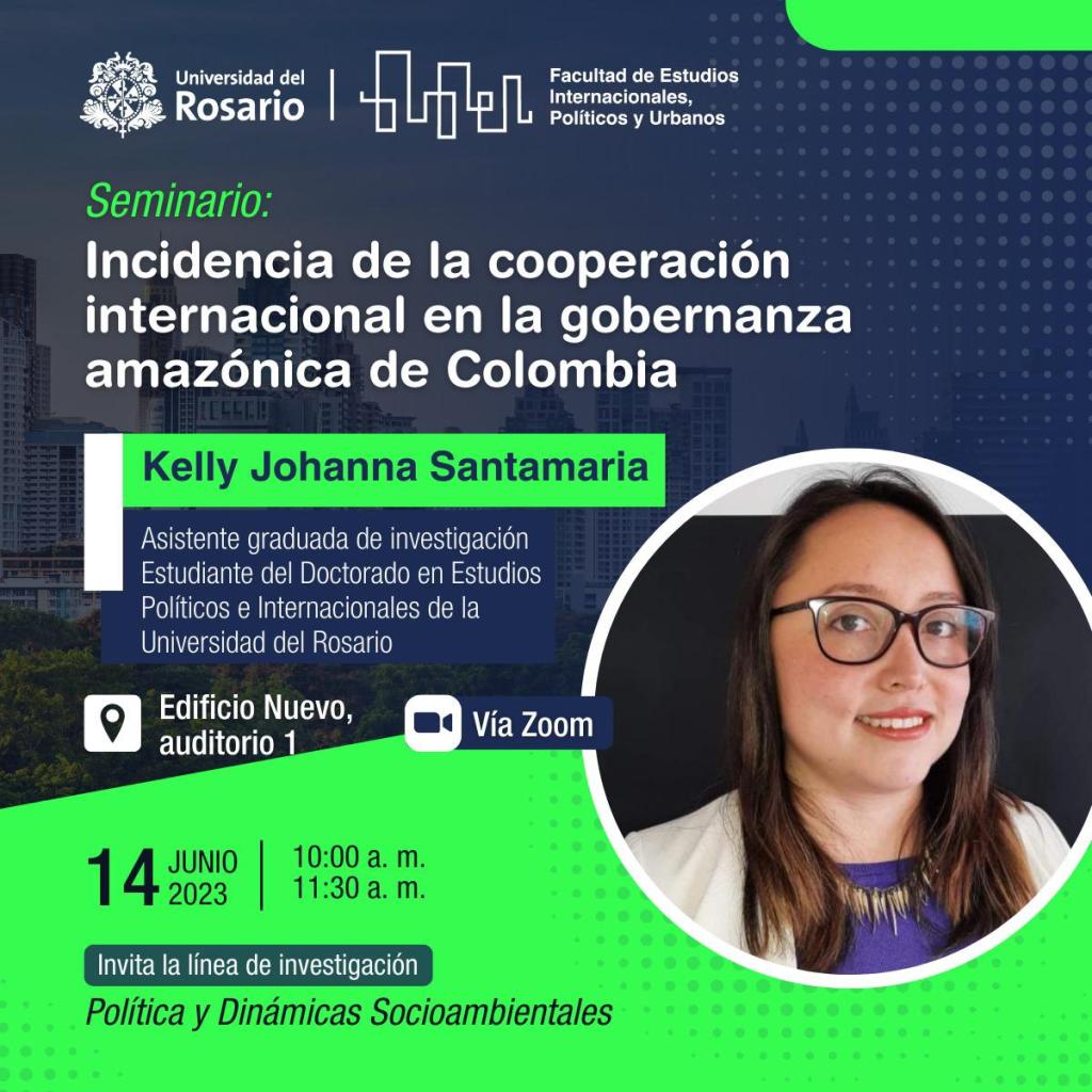 El miércoles 14 de junio, a partir de las 10am, la estudiante doctoral K. J. Santamaría presentará sobre la «Incidencia de la cooperación internacional en la gobernanza amazónica de Colombia» en el marco de los seminarios de la línea de investigación sobre política y dinámicas socioambientales de Facultad de Estudios Internacionales, Políticos y Urbanos.