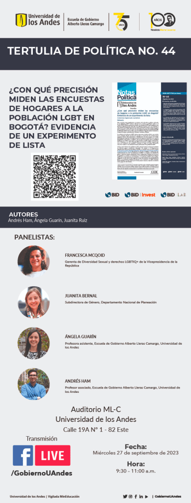 20 septiembre, 202320 septiembre, 2023 Juan David Gutiérrez R. Evento: Tertulia de Política No. 44 «¿Con qué precisión miden las encuestas de hogares a la población LGBT en Bogotá? Evidencia de un experimento de lista» Inscripción. Compártelo: Haz clic para compartir en X (Se abre en una ventana nueva) X Haz clic para compartir en Facebook (Se abre en una ventana nueva) Facebook Me gusta Cargando... Relacionado