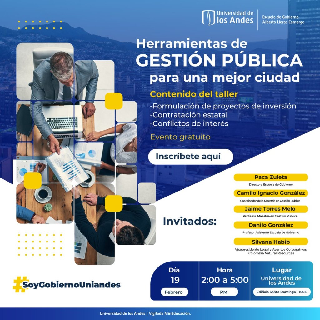 13 febrero, 2024 Juan David Gutiérrez R. Taller: «Herramientas de gestión pública para una mejor ciudad» (19 feb. Universidad de los Andes) Inscripciones: https://evento.uniandes.edu.co/es/herramientasdegestionpublicaparaunamejorciudad Compártelo: Haz clic para compartir en X (Se abre en una ventana nueva) X Haz clic para compartir en Facebook (Se abre en una ventana nueva) Facebook Me gusta Cargando... Relacionado