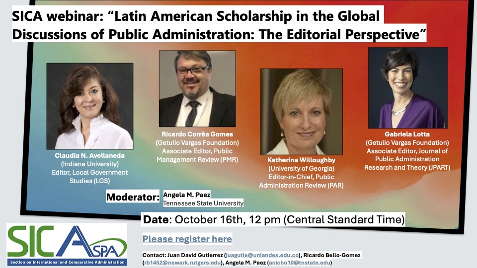 The Section on International and Comparative Administration (SICA) at ASPA is organizing the webinar “Latin American Scholarship in the Global Discussions of Public Administration: The Editorial Perspective”.