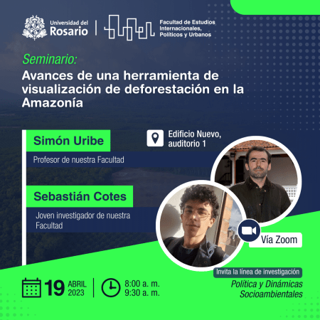 13 abril, 202313 abril, 2023 Juan David Gutiérrez R. Seminario: «Avances de una herramienta de visualización de deforestación en la Amazonía» (U. Rosario, 19 de abril)