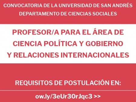 17 agosto, 202116 agosto, 2021 Juan David Gutiérrez R. Concurso para vincular a un/a profesor/a-investigador/a de tiempo completo en el área de Ciencia Política y Gobierno y Relaciones Internacionales (U. de San Andrés)